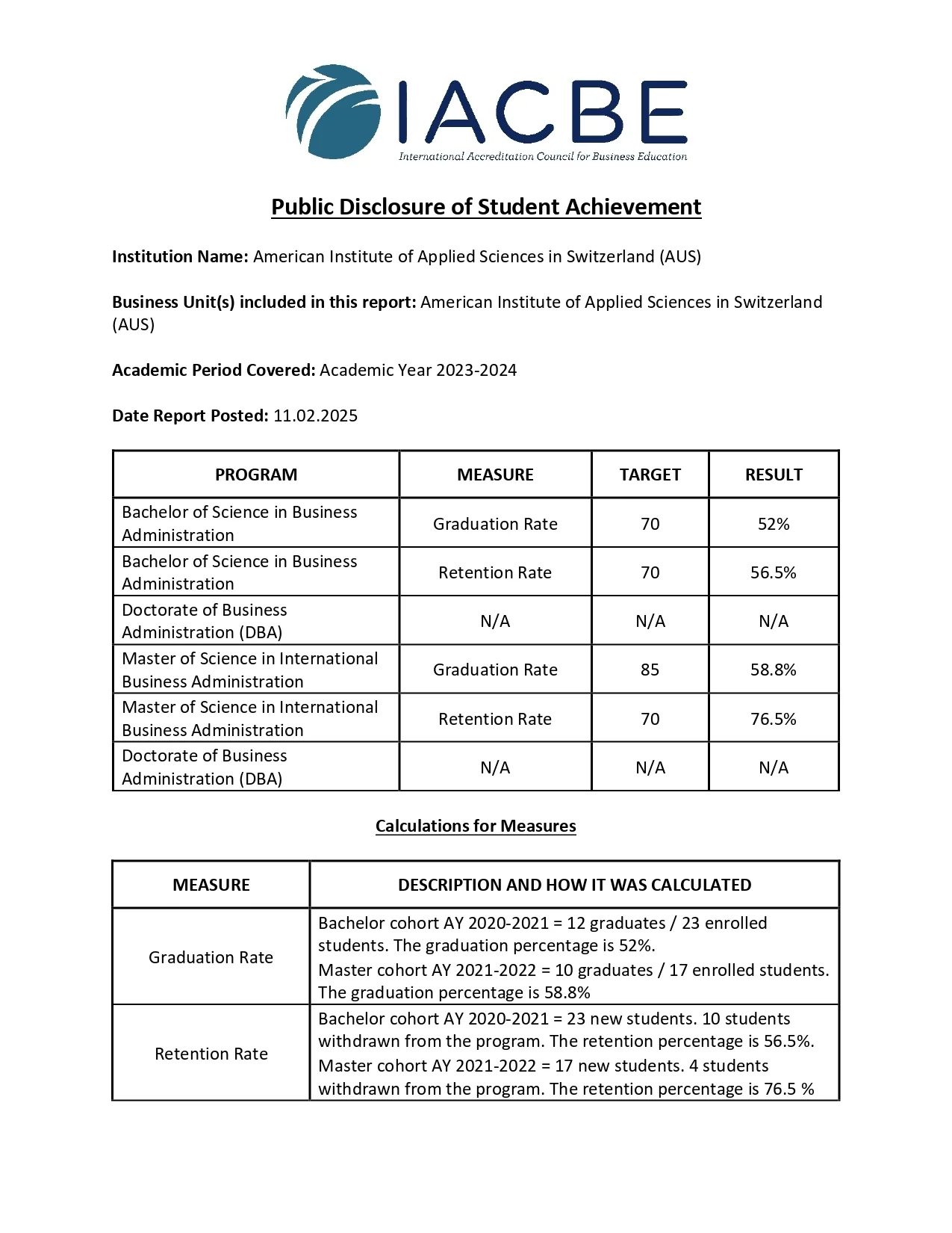 The American Institute of Applied Sciences in Switzerland (AUS) has received specialized accreditation for its business programs through the International Accreditation Council for Business Education (IACBE) located at 11960 Quivira Road in Overland Park, Kansas, USA. For a list of accredited programs, please view our IACBE